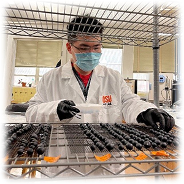 Former Ph.D. student, Jerry Lin, develops water resistant edible coatings for retaining anthocyanins and fruit integrity on processed blueberries.